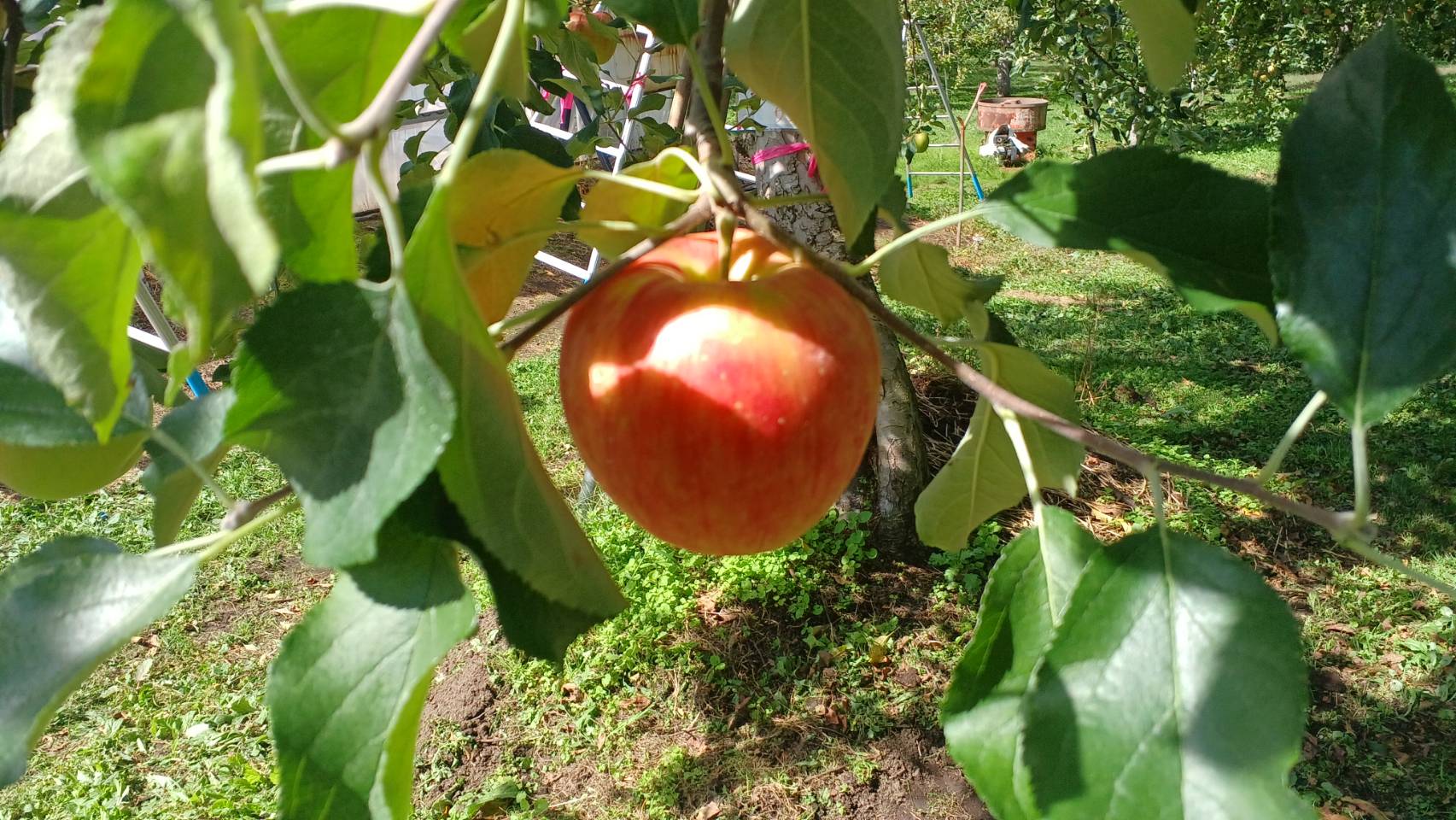 一方、高い枝にあった「さんさ」は、ちょっと個性的な姿。市場には出回らないような個性派ですが、こうした“出会い”もりんご狩りならではです。