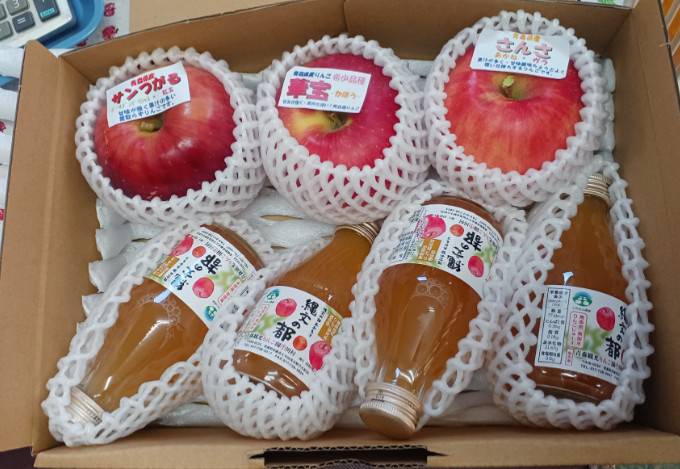 今回は「りんご3個+りんごジュース4本」の詰め合わせ(1,780円)をお願いし、お土産にしました。