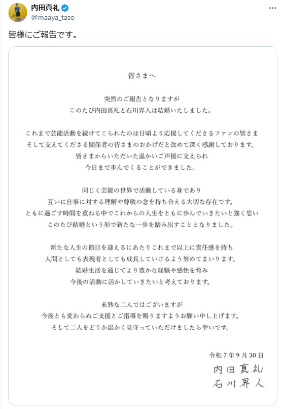 数々のアニメやゲームで活躍する人気声優・内田真礼(うちだ まあや)さんが、石川界人さんとこのたび結婚を発表しました。ファンからは祝福の声が相次ぎ、SNSでも大きな話題となっています。