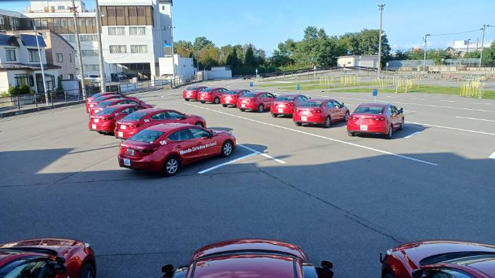 普通自動車の教習車はすべてマツダ製で、ボディの艶やかさと統一感は圧巻。