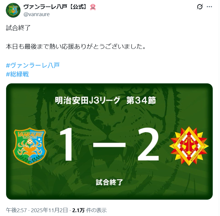 2025年11月2日、明治安田生命J3リーグ第34節で、首位を走るヴァンラーレ八戸がホームのプライフーズスタジアムで8位のギラヴァンツ北九州を迎えた。試合は後半の激しい攻防の末、八戸が1-2で敗北。直近の栃木シティ戦に続く連敗となり、J2自動昇格に向けた戦いに暗雲が立ち込めている。入場者数は2,576人を記録した。