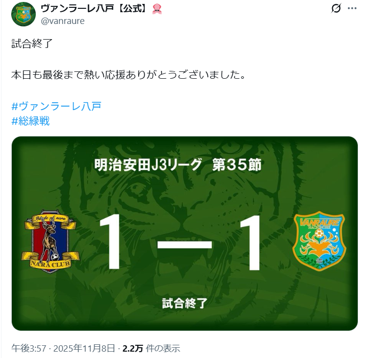 2025年11月8日、明治安田生命J3リーグ第35節で、ヴァンラーレ八戸はアウェーで奈良クラブと対戦し、1-1の引き分けに終わった。試合はロートフィールド奈良で行われ、2,142人の観客が見守る中、両チームが激しい攻防を繰り広げた。この結果、八戸は勝ち点1を加え、リーグ戦での連敗を止めたものの、上位争いでの厳しい状況が続く。