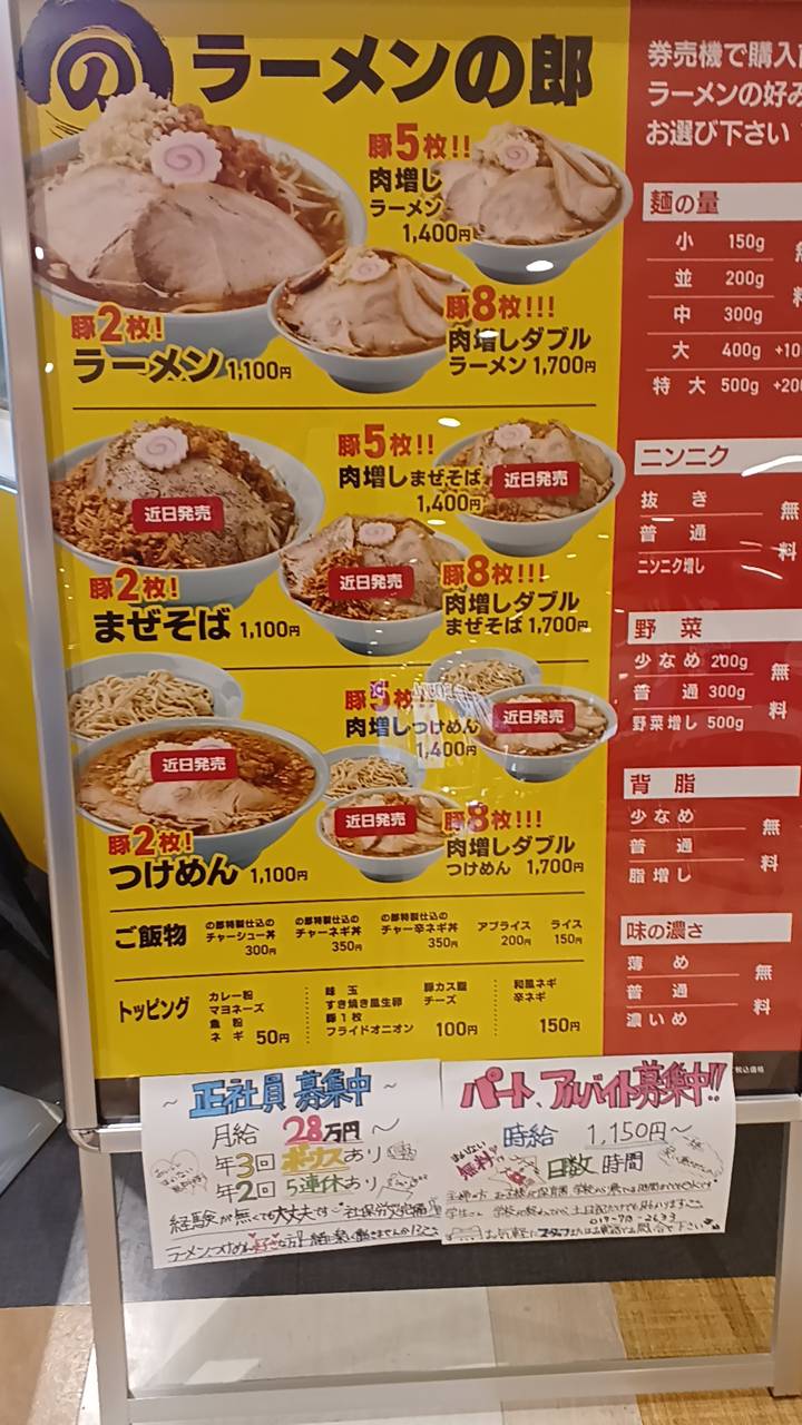 二郎系ラーメンといえば、極太麺に大量の野菜、厚切りチャーシュー、ニンニクたっぷりのガッツリとしたイメージが強いが、「ラーメンの郎」ではそれをマイルドにアレンジ。青森大勝軒のノウハウを活かし、子どもや女性も楽しめるよう配慮されている。例えば、麺の量を150g(小)、200g(並)、300g(中)、400g+10(大)、500g+200(特大)と細かく選べるほか、背脂や味の濃さを調整可能。オープン時の宣伝では「家族連れにやさしい二郎系爆誕!」と銘打たれ、地元メディアやYouTubeで紹介されている。