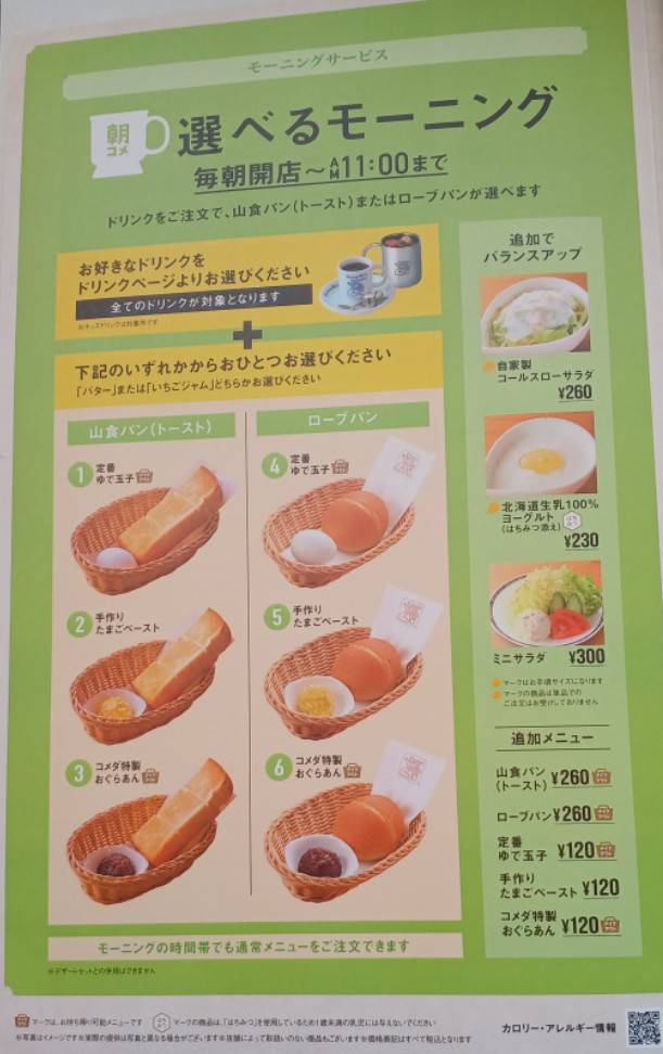 朝7:00から営業しており、ドリンクを頼むとモーニング(トースト+トッピング)が無料で付く定番スタイル。