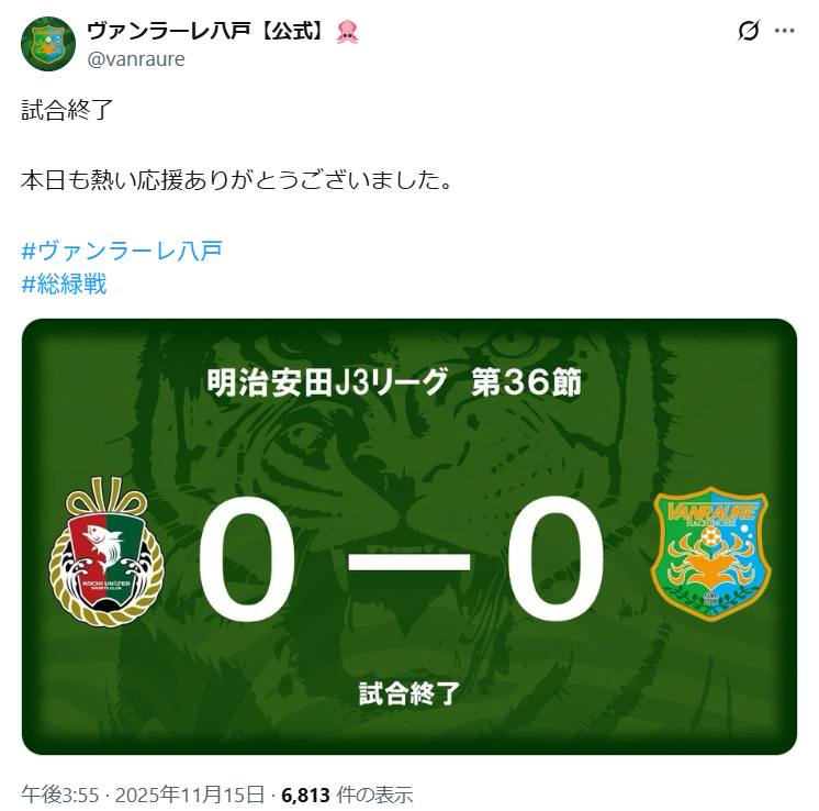 2025年11月15日、高知県立春野総合運動公園陸上競技場 – J3リーグ第36節で、ヴァンラーレ八戸はアウェーで高知ユナイテッドSCと対戦し、0-0の引き分けに終わった。この結果、八戸は勝ち点1を加え、J2昇格争いのトップ争いを維持。他チームの結果次第で、明日にも昇格が決まる可能性を残した。一方、高知はこれによりJ3残留を自力で確定させた。