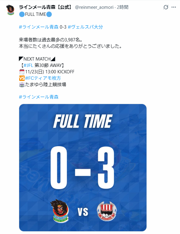 ラインメール青森は青森市を本拠地とし、地元企業やファンに支えられてきた。2023年や2024年シーズンでも昇格圏内に迫ったが、観客動員やライセンス取得のハードルで苦しんできた歴史がある。今回の失敗を受け、クラブは公式声明で「J3昇格に向けて最後まで戦い抜く」との決意を表明しているが、来シーズンに向け、さらなる集客力向上とチーム強化が求められる。