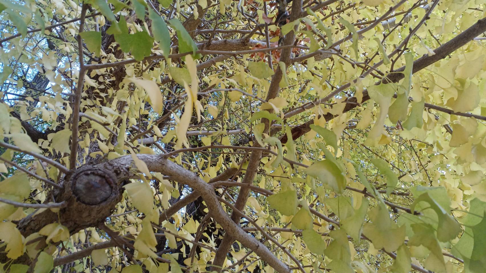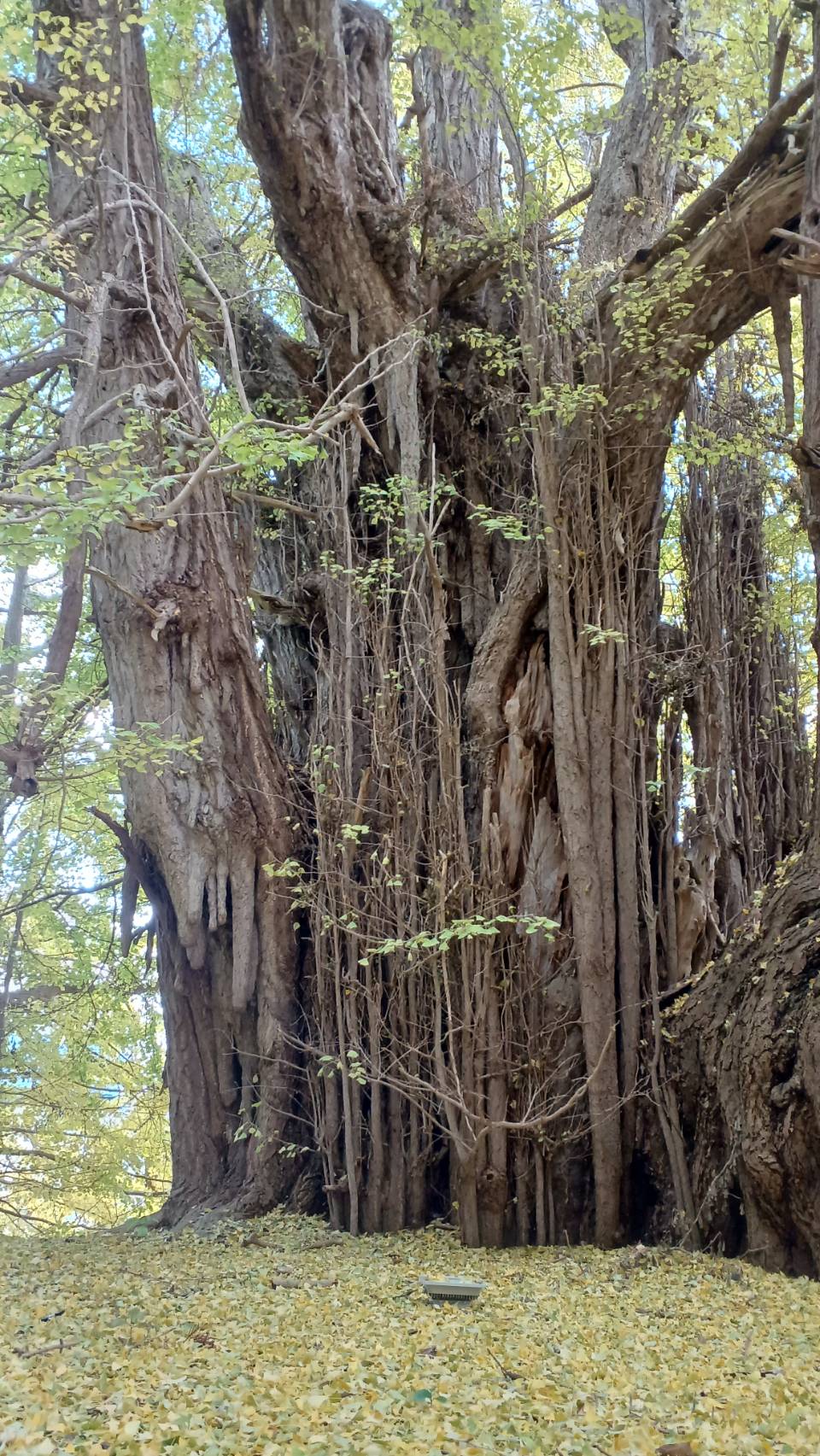 実際に立つと、その存在感は想像以上。根元から見上げると、枝はまるで山のように広がり、視界いっぱいに黄金の葉が迫ります。