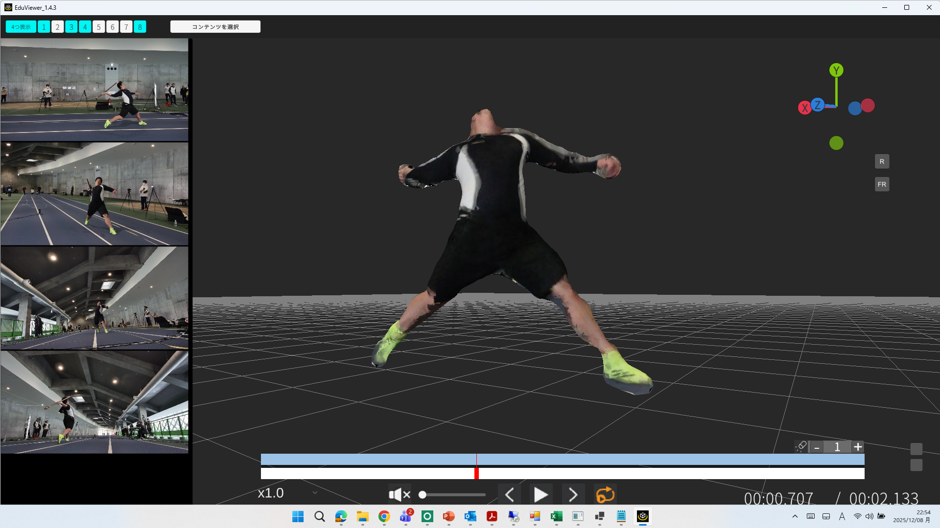 現場ではカメラを8台置くことにより、人間のリアルな動きをとらえることが可能です。もちろん設営には費用は掛かりますが、これはスポーツだけの利用に留まらず、南部神楽や獅子踊りのアーカイブ作成など伝統芸能の分野にまで使うことができます。つまり教師用として教師自身が見本を撮ることはもちろんのこと、未来に技術や文化を残すためにデータを残しておくという使い方もできるわけです。