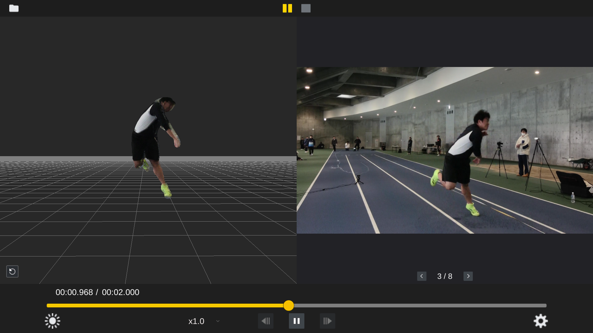 またやり投げの映像も3Dカメラを通して拝見させていただいたのですが、本来ならばやり投げ選手の近くにいては競技の妨げになるところ、バーチャルに置き換えることにより安全にかつ間近で投手の姿勢や投げ方、槍の進む様子まで写っておりました。テレビで見るような映像よりもはるかに至近距離で見ることが出来るので、自分の姿を撮ることが出来れば反復練習に使うことも可能でしょう。