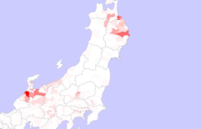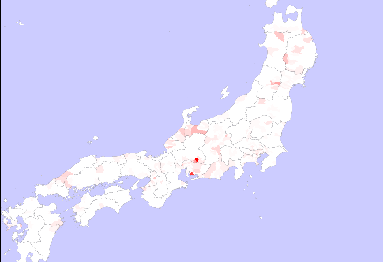 橋場さんにターゲットを変えてみると、あら不思議。石川県辺り、特に金沢市が約400人と全国でも一番多いのですが、次に多いのがなんと青森県八戸市。約300人と示されていました。マップで見る感じ、八戸から岩手県北部にかけて多そうよね。青森県内だと階上と十和田にも多いらしい。