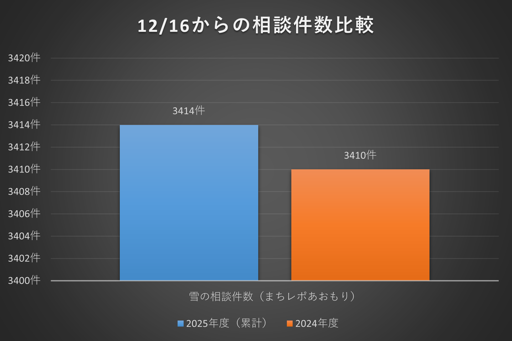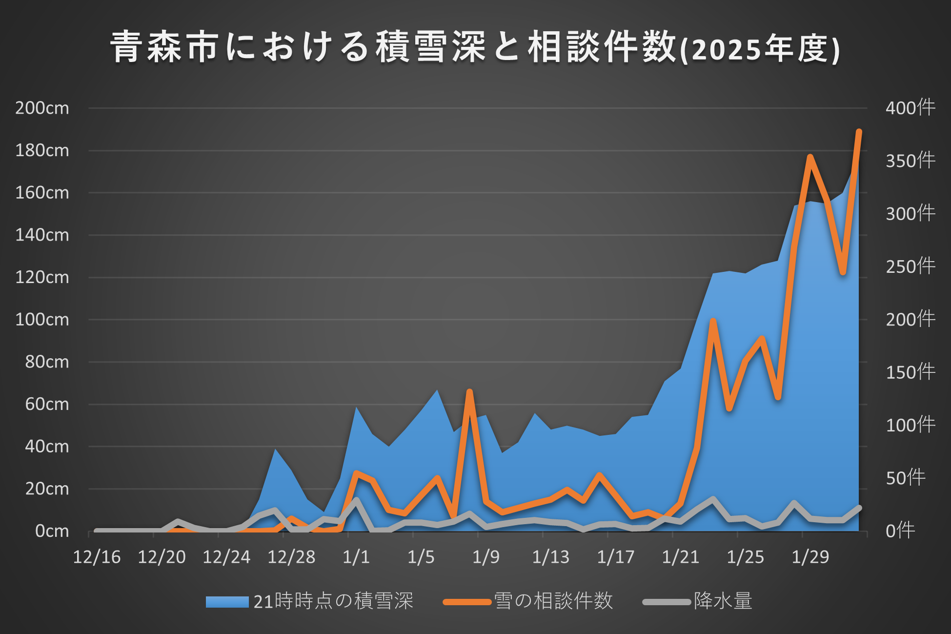 青森市の「まちレポあおもり」で、雪に関する日毎の相談件数が2026年2月1日に378件となり、1月29日の354件を上回って過去最多を更新した。年始にピークを迎えた昨年度と違い、今年度は1月下旬から急増。記録的な積雪水準の中、宅配の停止や公立小中学校の登校見合わせなど、生活インフラにも影響が広がっている。