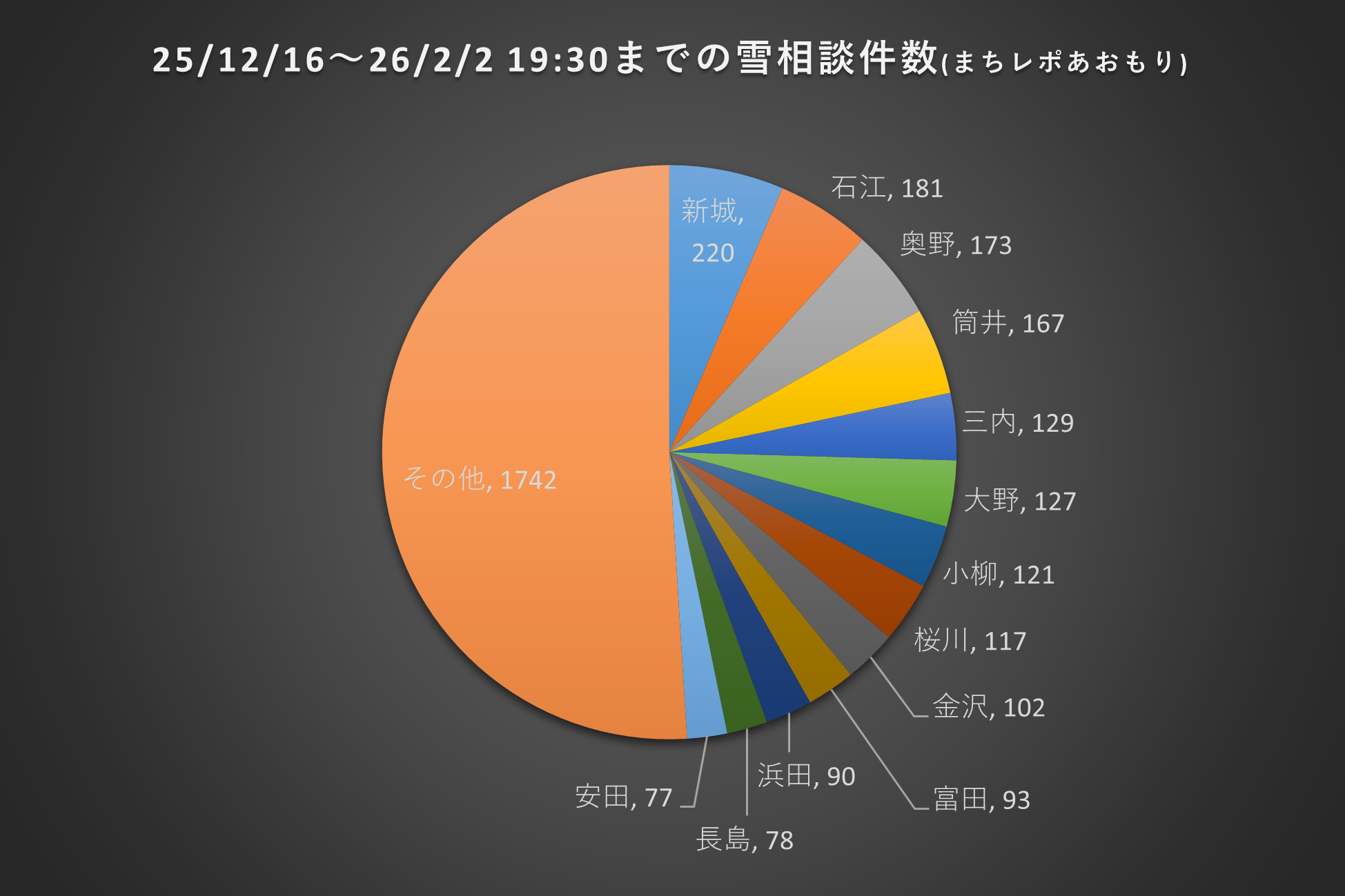 「青森市」の「まちレポあおもり」に投稿された雪相談を、25/12/16〜26/02/02 19:30で地区別に集計すると合計3414件。
