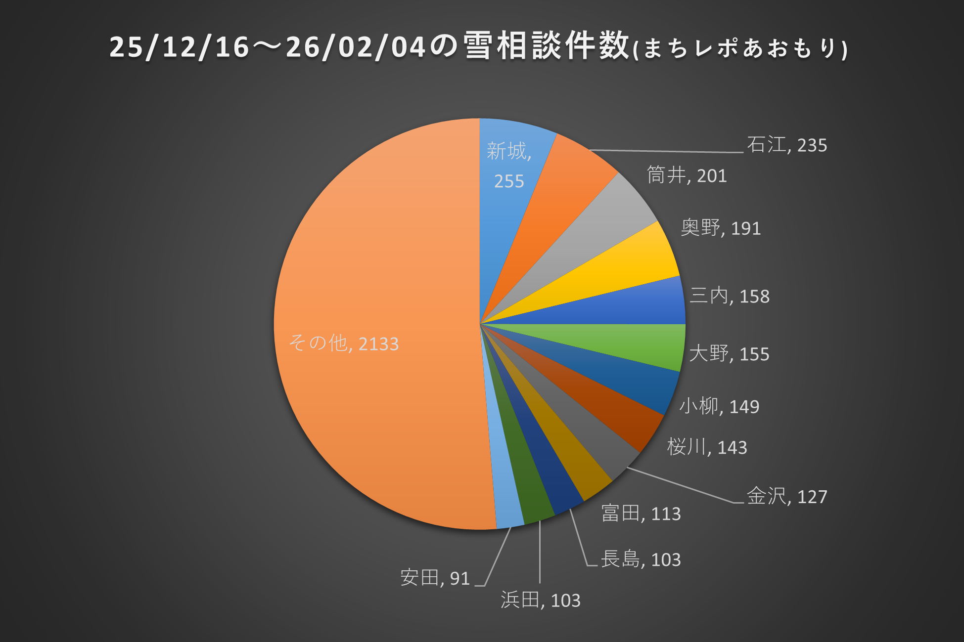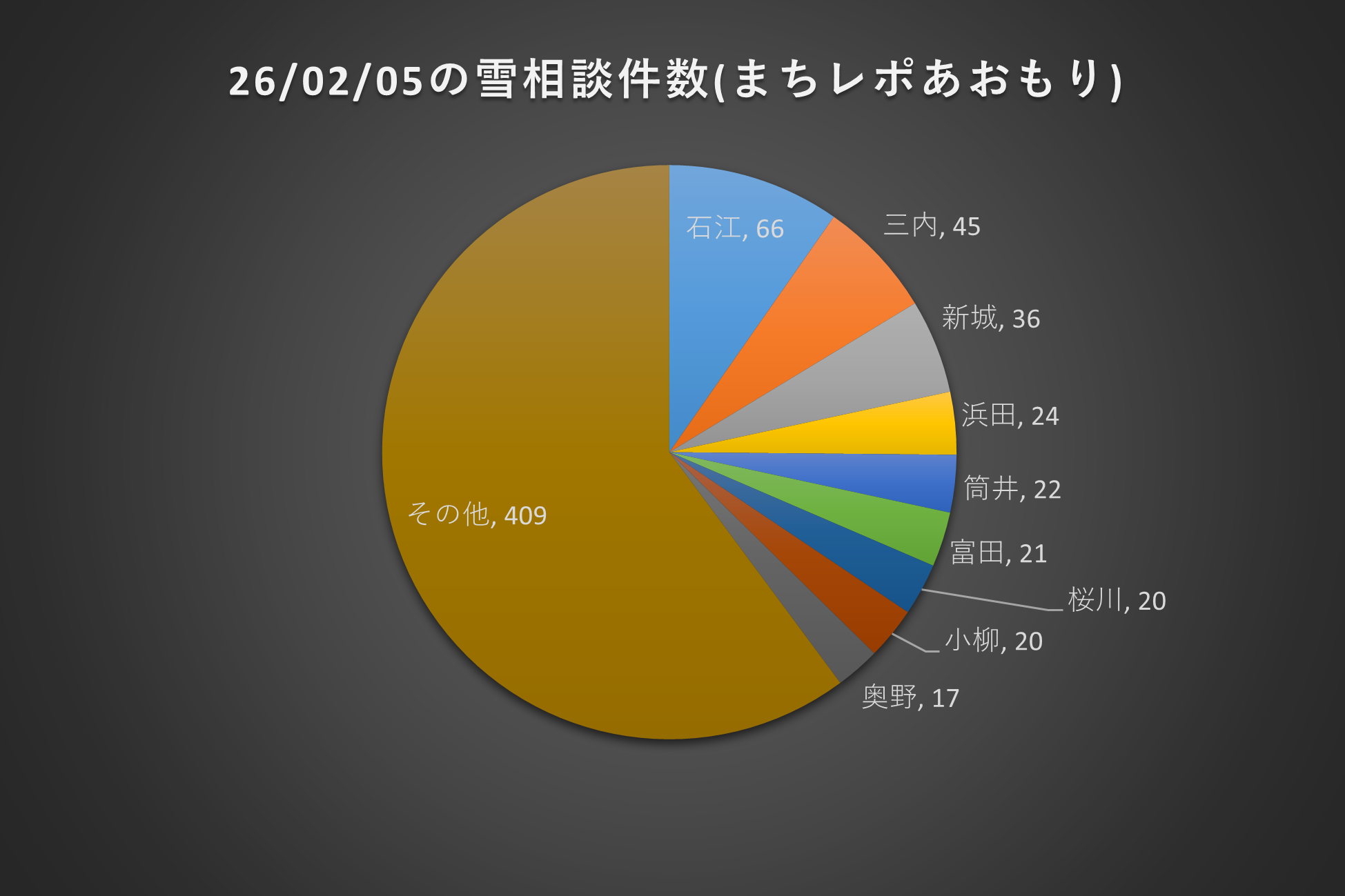 編集後記:本日26/02/07集計のまちレポあおもり雪相談は22時時点で約300件となっており、前日より半減している。このまま雪の心配はなくなっていくことを期待したい。