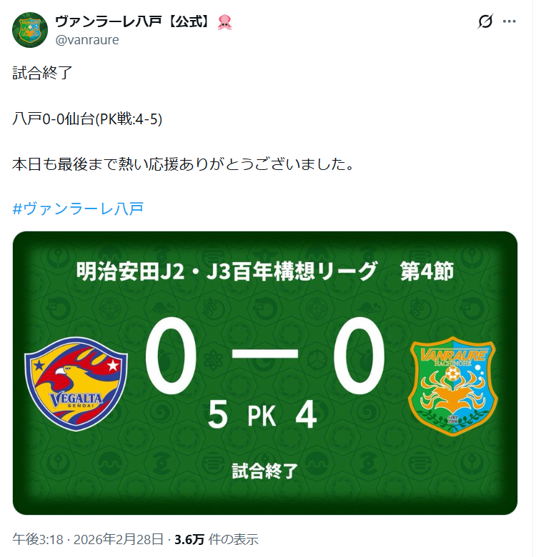 ヴァンラーレ八戸は2026年2月28日、ユアテックスタジアム仙台で行われた明治安田J2・J3百年構想リーグ地域リーグラウンド第4節でベガルタ仙台と対戦し、90分を0-0で終えた後、PK戦の末に4-5で敗れた。