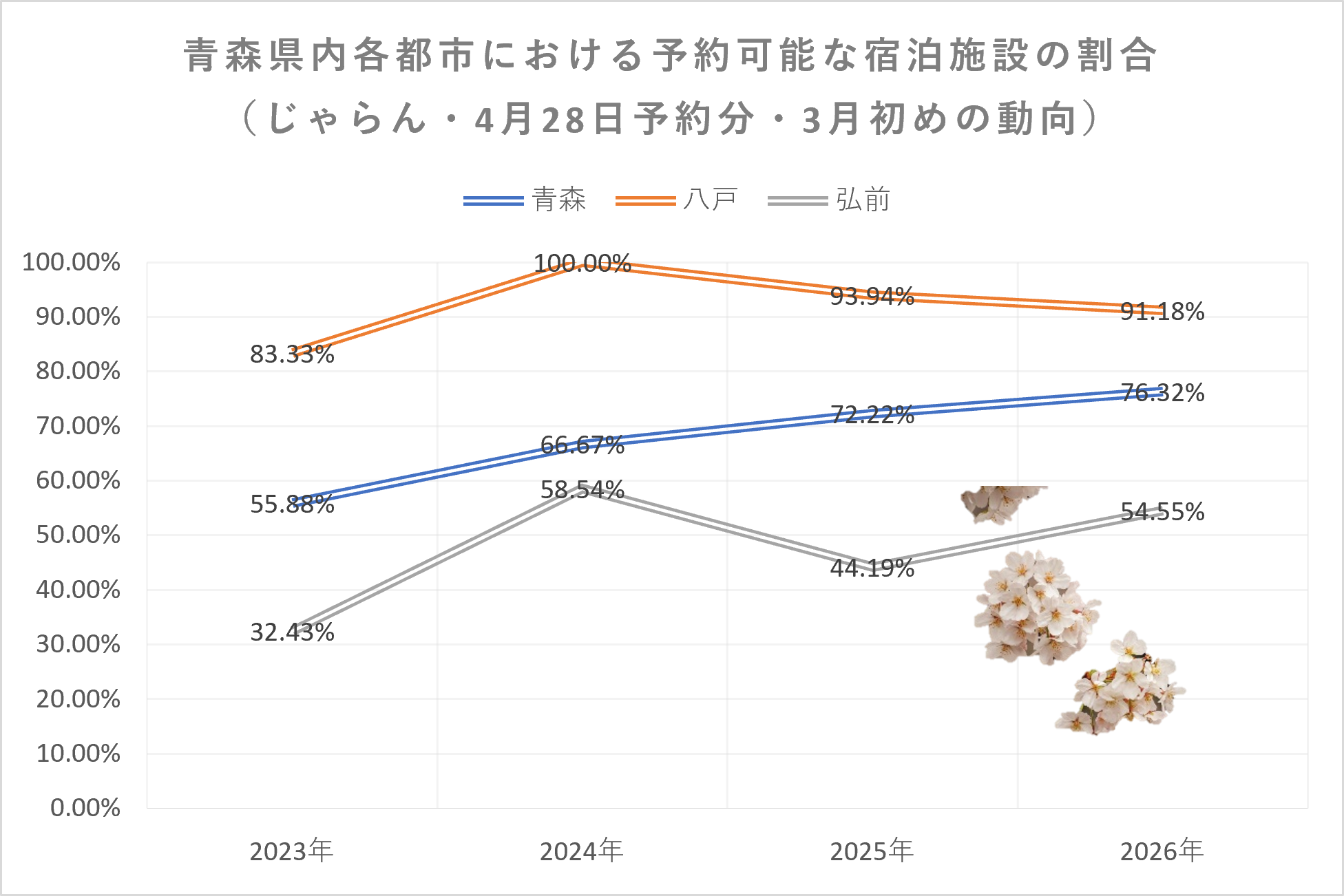 そのため、春の青森県内で宿を探す際は、「県内で探す」だけでは実態に合わない。弘前・青森・八戸で、予約のしやすさそのものがかなり違うと考えたほうがよさそうだ。