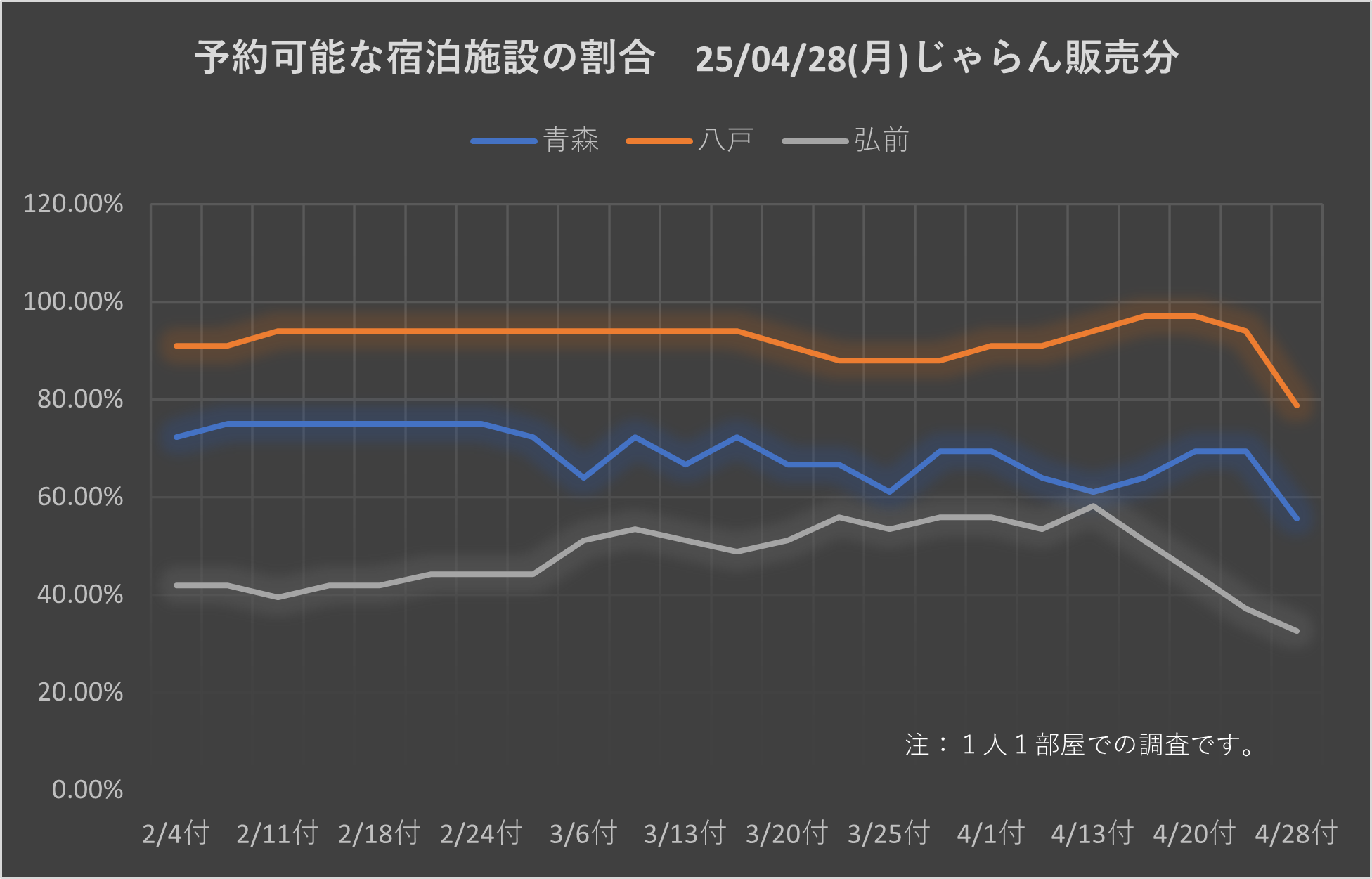 これは、春の観光需要が地域ごとに偏っていることを示している。弘前は例年、宿泊日のかなり前から客室販売が動きやすく、日程が近づくほど選択肢が絞られていく。いっぽう八戸は、同じ県内でも販売件数に比較的厚みが残りやすく、満室に近づくスピードが弘前ほど急ではないことがうかがえる。