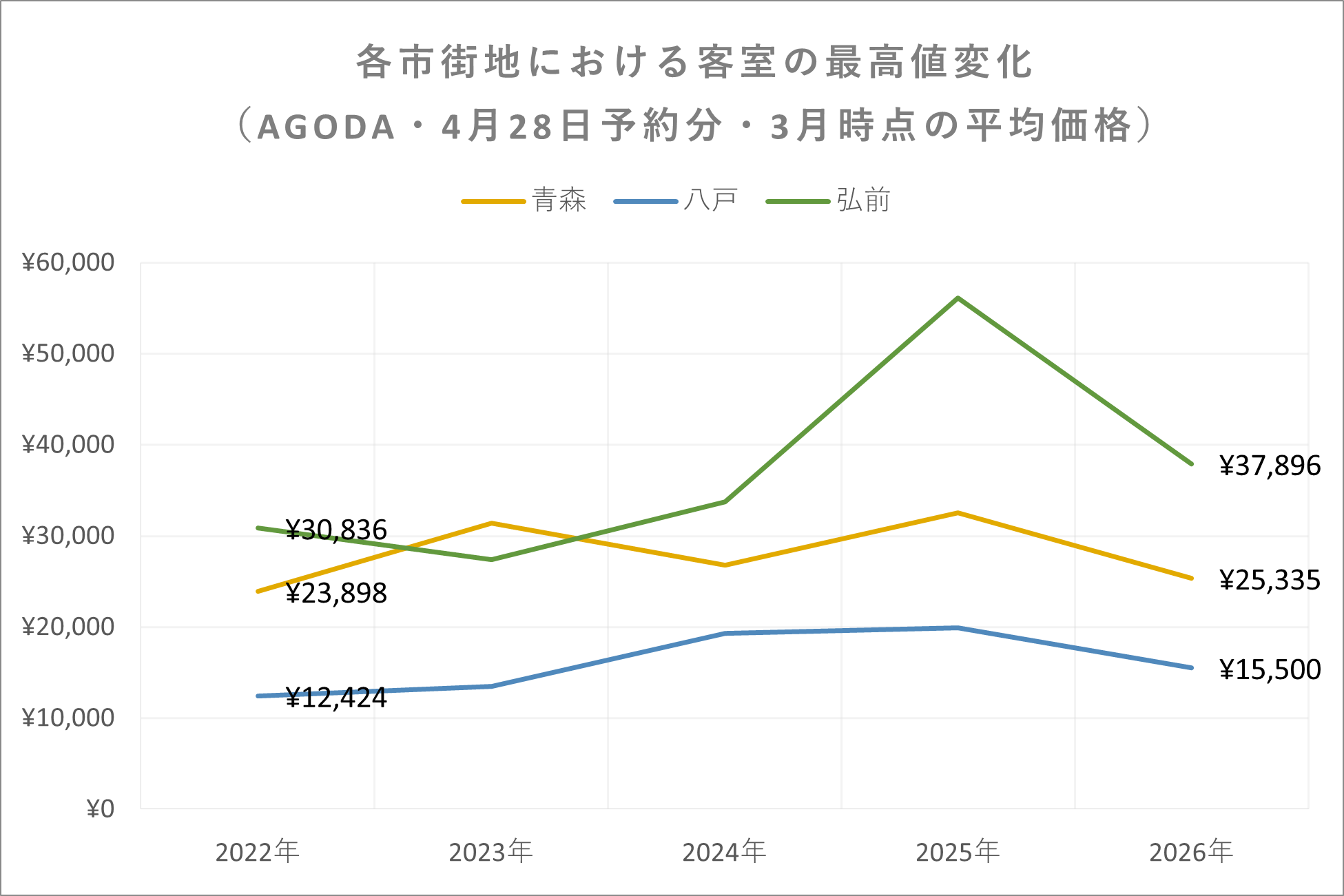 つまり、春の宿泊相場は「弘前だけ」「青森だけ」で完結しているわけではなく、3地域が連動しながら動いているとみるほうが実態に近い。