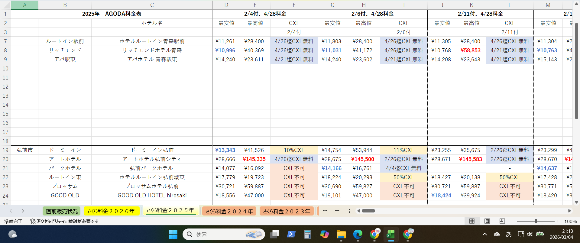 とくに弘前では、客室数が絞られていく過程で高額プランだけが残りやすく、価格の上限が大きく跳ねる年が見られる。これは「弘前の宿が全部高い」という意味ではなく、予約が進んだあとの残室構成が高額寄りになりやすいということでもある。