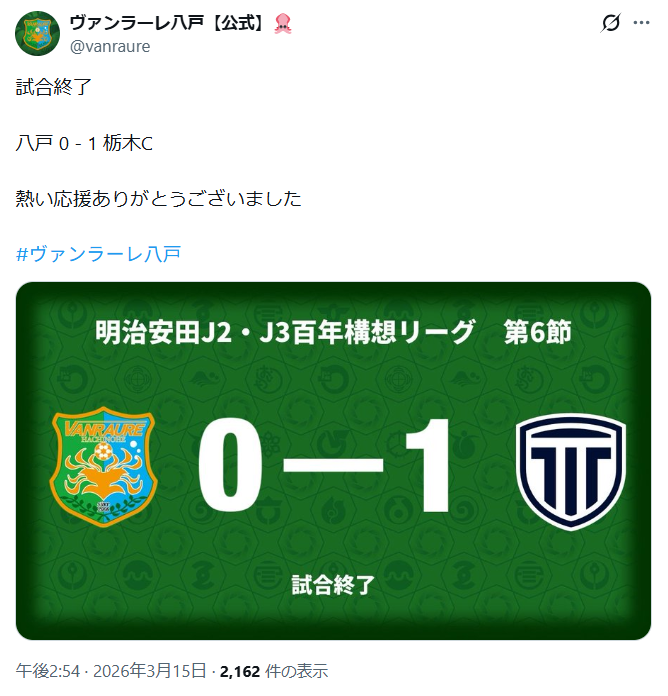 ヴァンラーレ八戸は3月15日、プライフーズスタジアムで栃木シティと対戦し、0-1で敗れた。失点は前半11分。Jリーグ公式データでは、八戸はシュート19本、CK7本を記録しながらも最後まで得点を奪えず、ホームで勝点を積み上げることはできなかった。