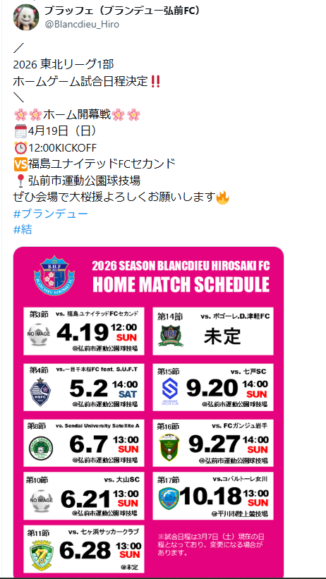 加えて、3月7日には2026東北社会人サッカーリーグ1部のホームゲーム日程が決定。3月11日からは弘前駅ビル アプリーズ1階「弘前物産パルシー」でクラブグッズの販売も始まった。次の公式戦としては、3月22日に青森県サッカー選手権大会2回戦が予定されている。