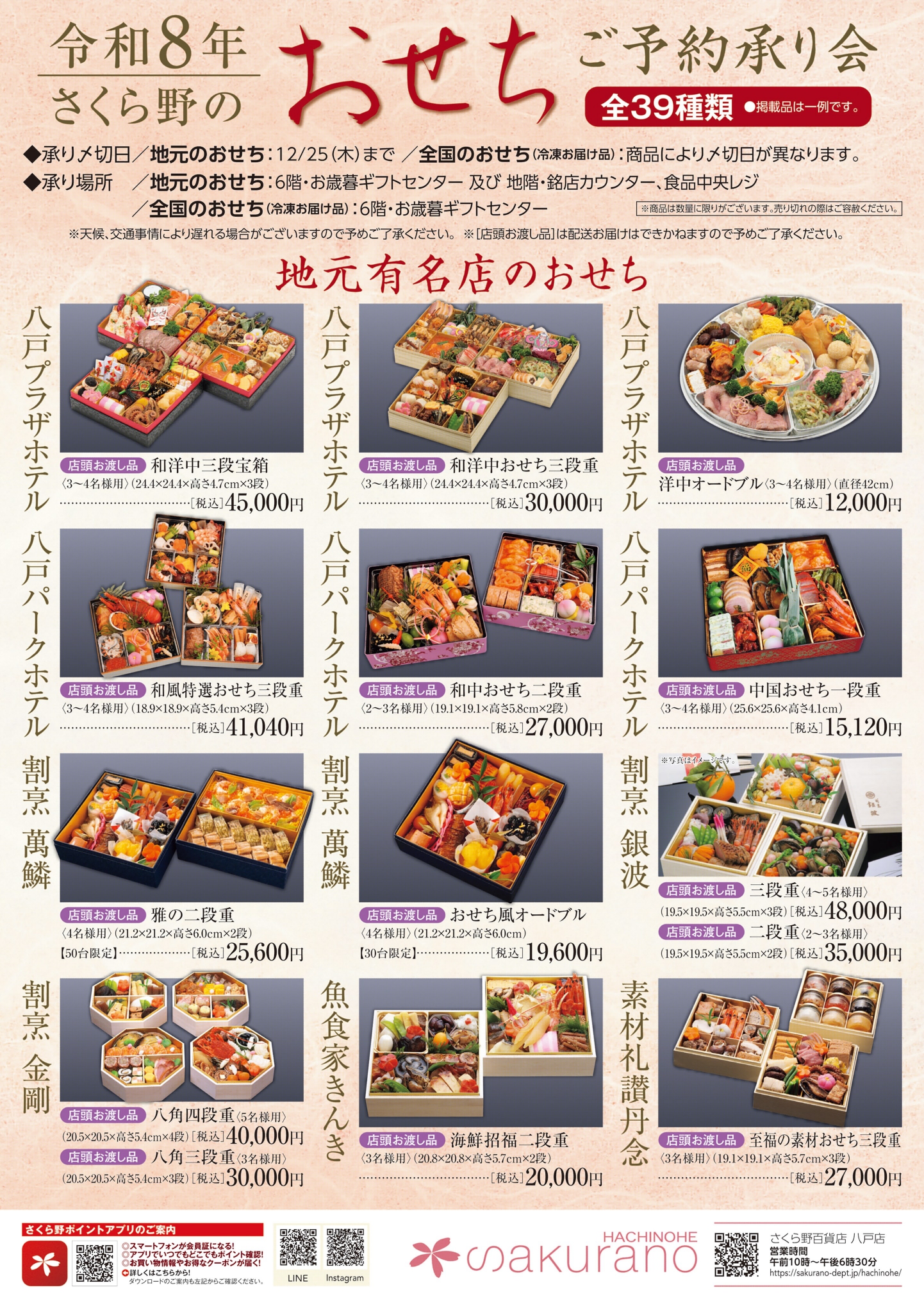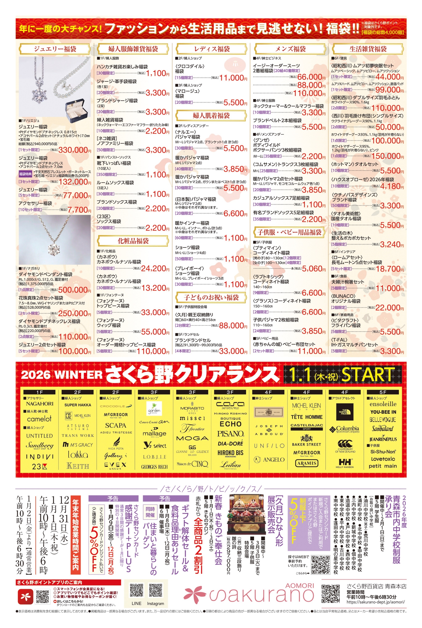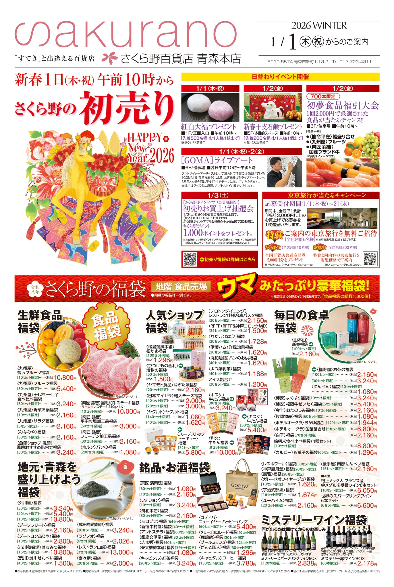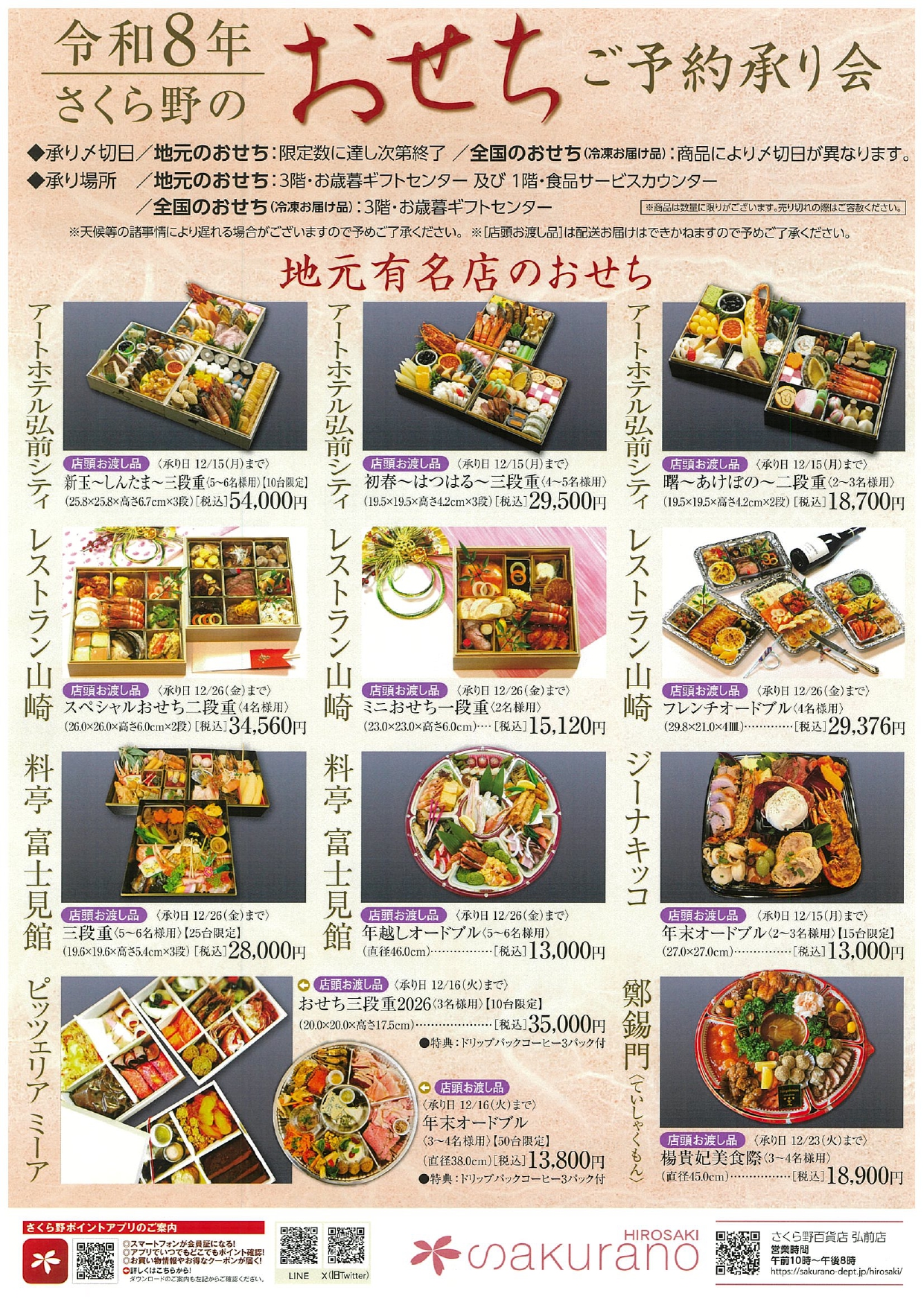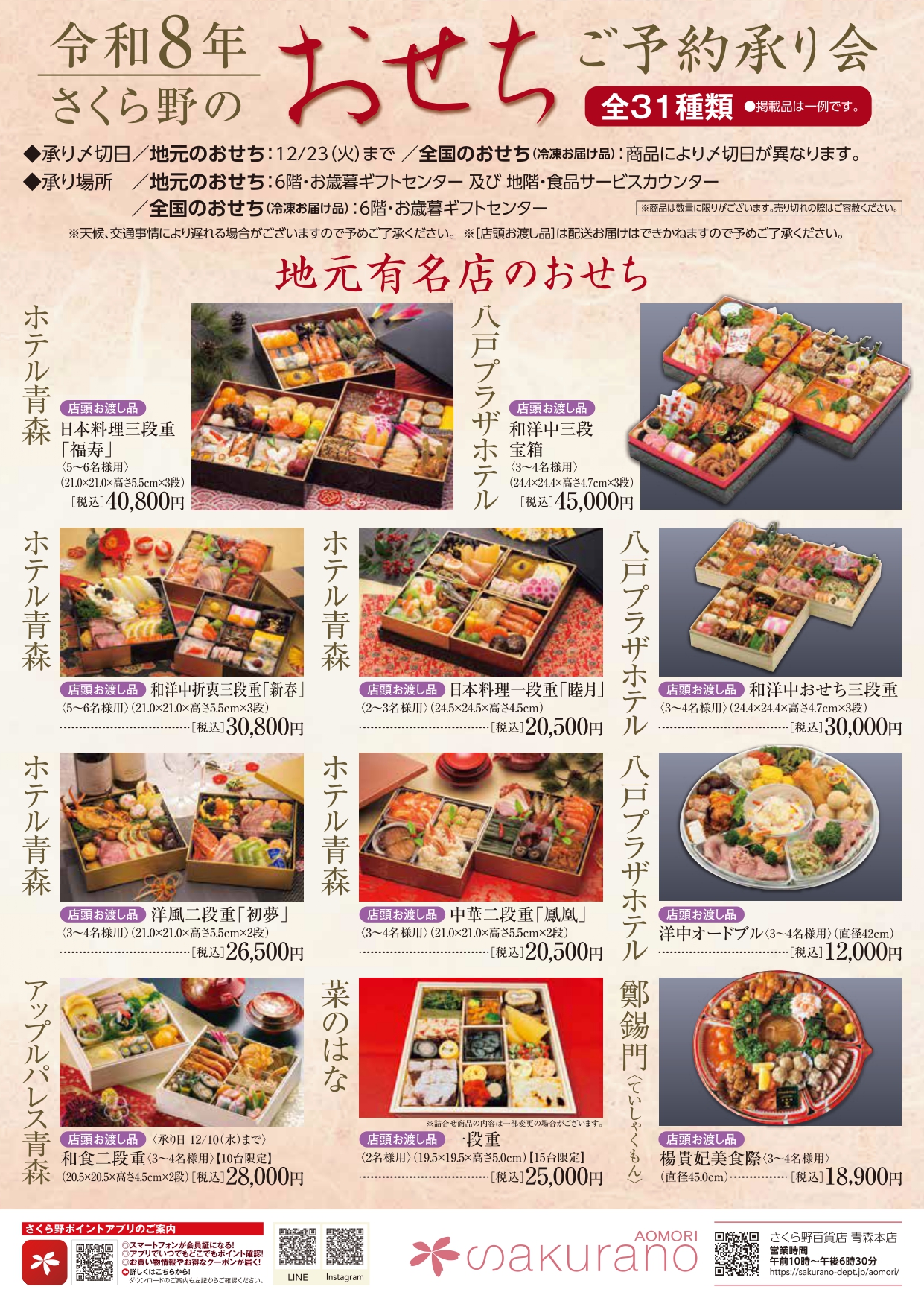 本店は株式会社さくら野百貨店の本社も兼ねており、青森県内外から多くの買い物客が訪れます。食品、衣料品、化粧品、雑貨、伝統工芸品など幅広い商品を取り扱い、地域の生活拠点として親しまれています。営業時間は10:00~18:30(または19:00までの日もあり)、定休日は不定休です。