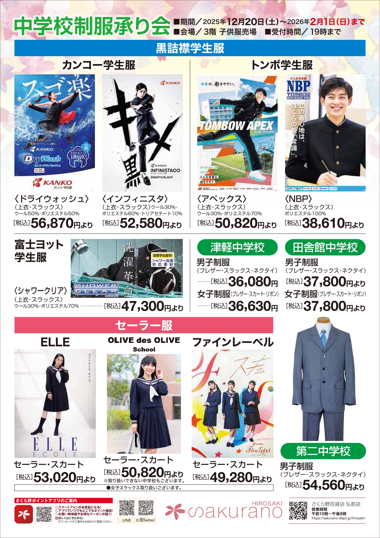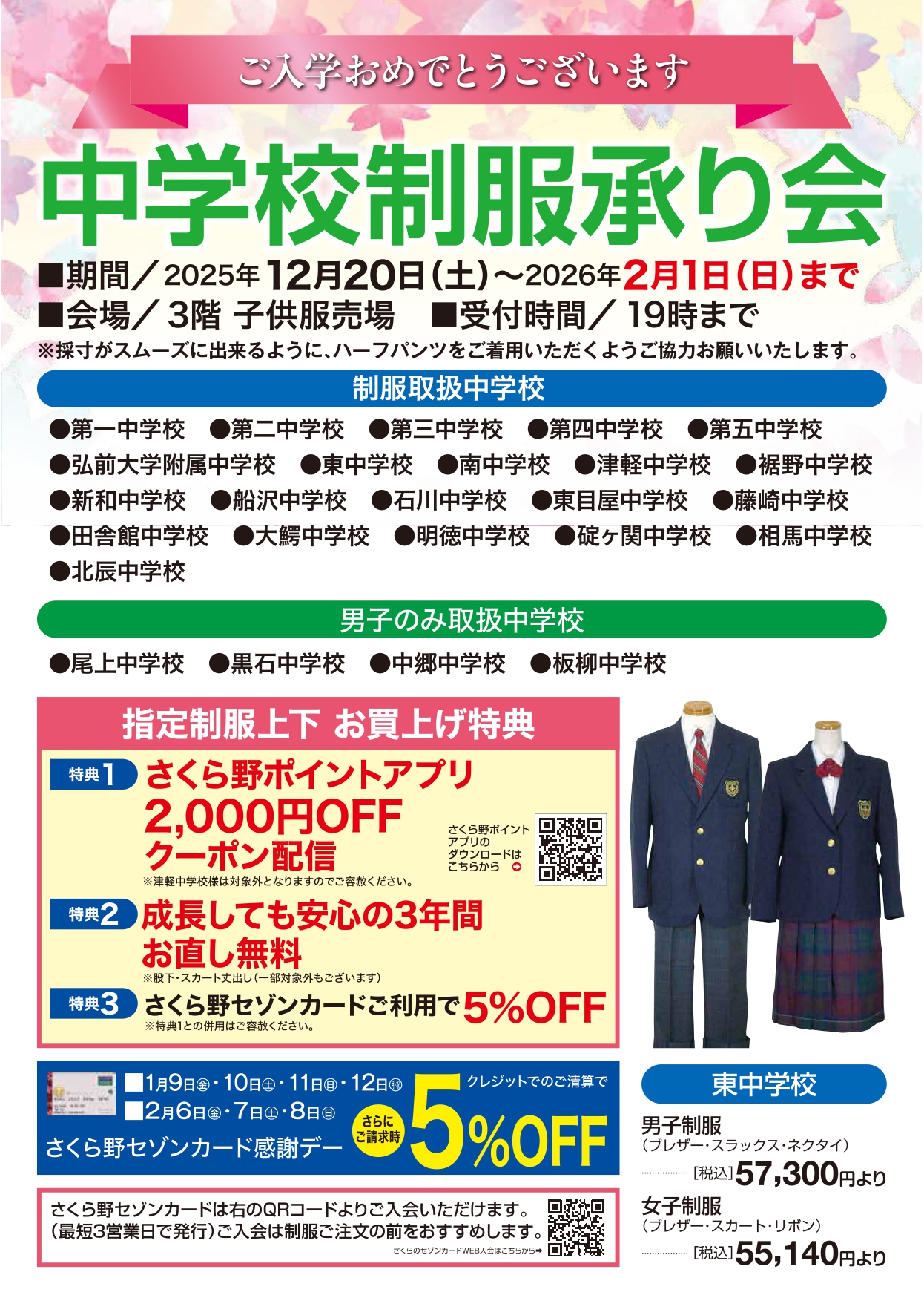 弘前市内・周辺地域中学校制服承り会12/20(土)~2/1(日)会場:3階子供服売場