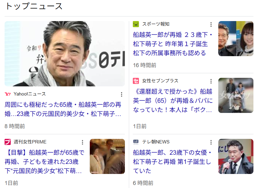 2025年8月28日、俳優の船越英一郎さん(65)が、女優でアーティストの松下萌子さん(42)と再婚していたことが明らかになりました。すでに1歳になる第1子も誕生しており、両者の所属事務所が事実を認めています。船越さんは…