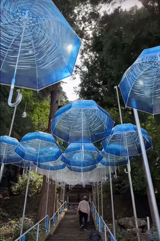 ・ 青森県 青森市 浅虫八幡宮 青い森鉄道 浅虫温泉駅から歩いて約20分 浅虫きっての隠れスポットに最近あるものが 話題となりました! それは、階段に出来たたくさんの傘! 通称「アンブレラスカイ」 津軽びいどろの風鈴傘を…